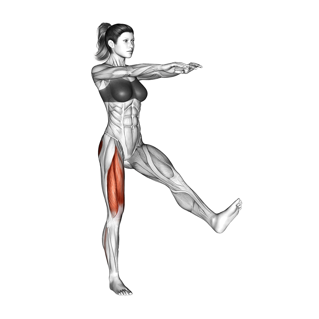 Agache com uma perna enquanto a outra se mantém estendida à frente, descendo até próximo ao chão e subindo com controle.