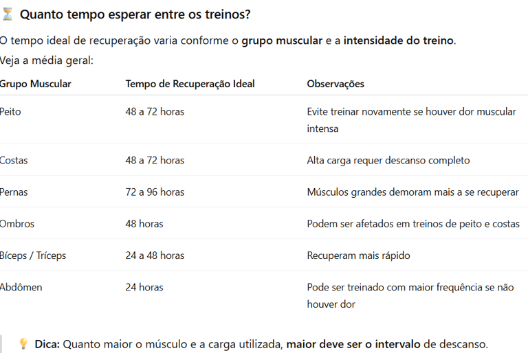 Respeitar o tempo de regeneração de cada grupo muscular é o que garante progresso contínuo, força e estética a longo prazo.